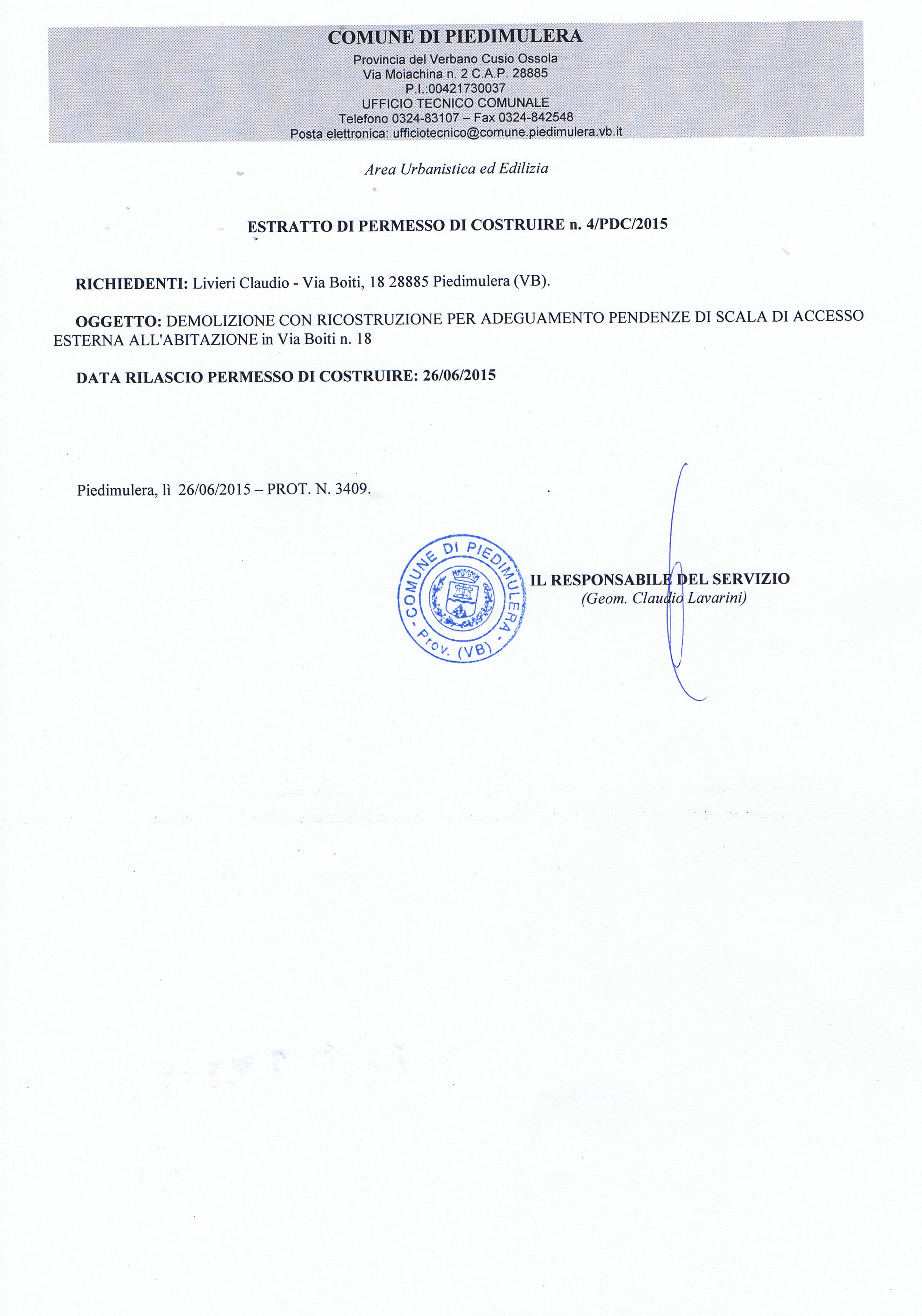 | Descrizione | RILASCIO PERMESSO DO CISTRUIRE N. 4/PDC/2015 |