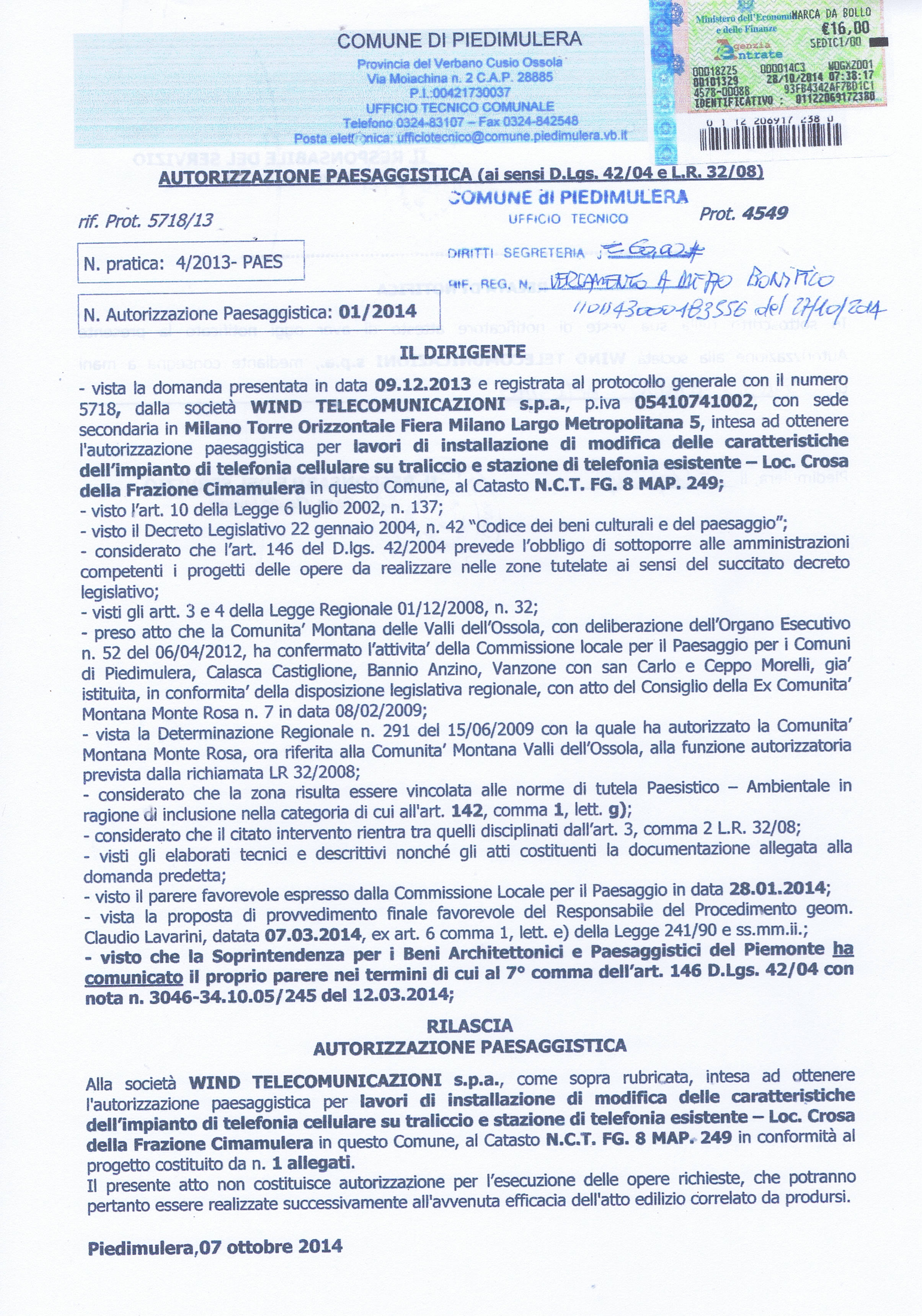 | Descrizione | LAVORI DI INSTALLAZIONE E DI MODIFICA DELLE CARATTERISTICHE DELL'IMPIANTO DI TELEFONIA CELLULLARE SU TRALICCIO E STAZIONE ESISTENTE - LOC. CROSA |