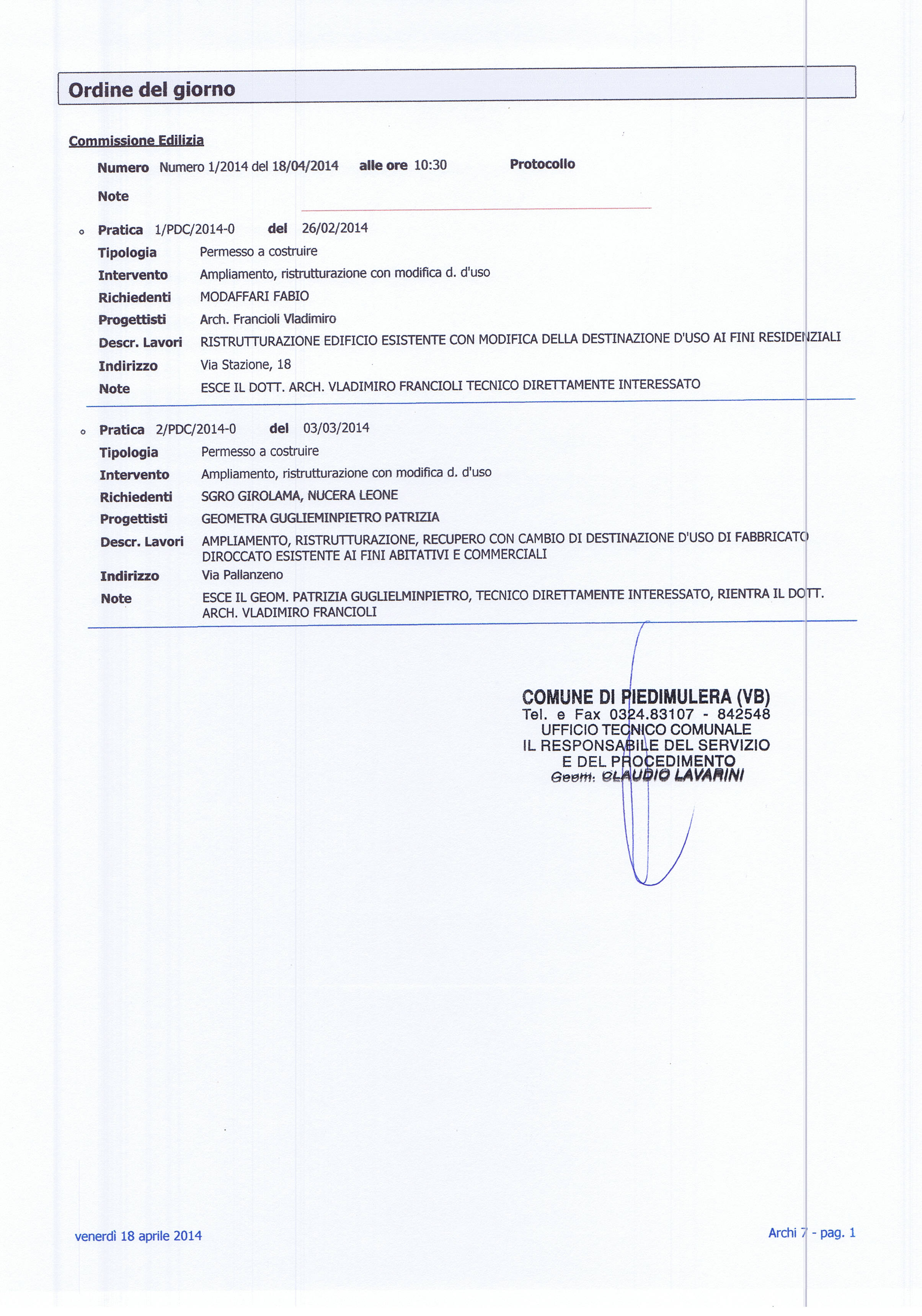 | Descrizione | RISULTANZE ED ESITI SEDUTA COMMISSIONE EDILIZIA DEL 18/04/2014 |