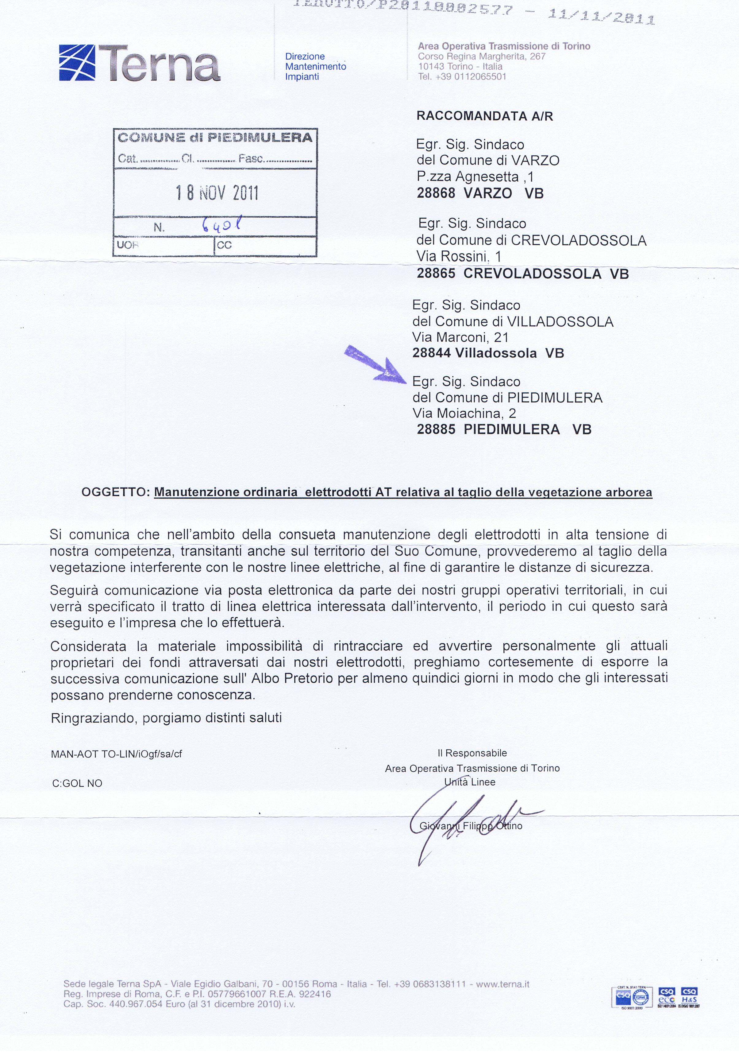 | Provenienza | TERNA -Direzione mantenimento Impianti |