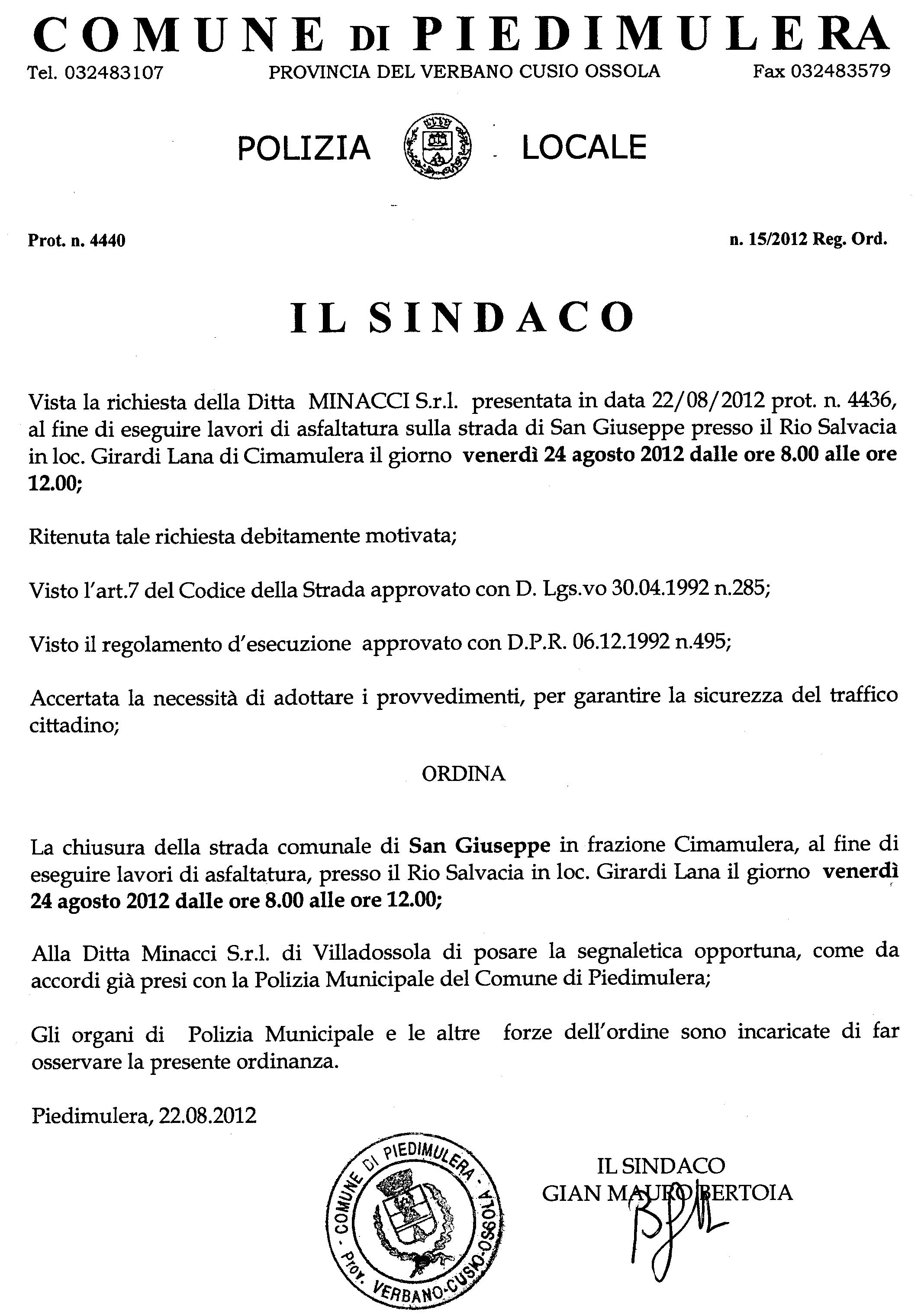| Titolo | CHIUSURA STRADA DI SAN GIUSEPPE PER ASFALTATURA RIO SALVACIA |