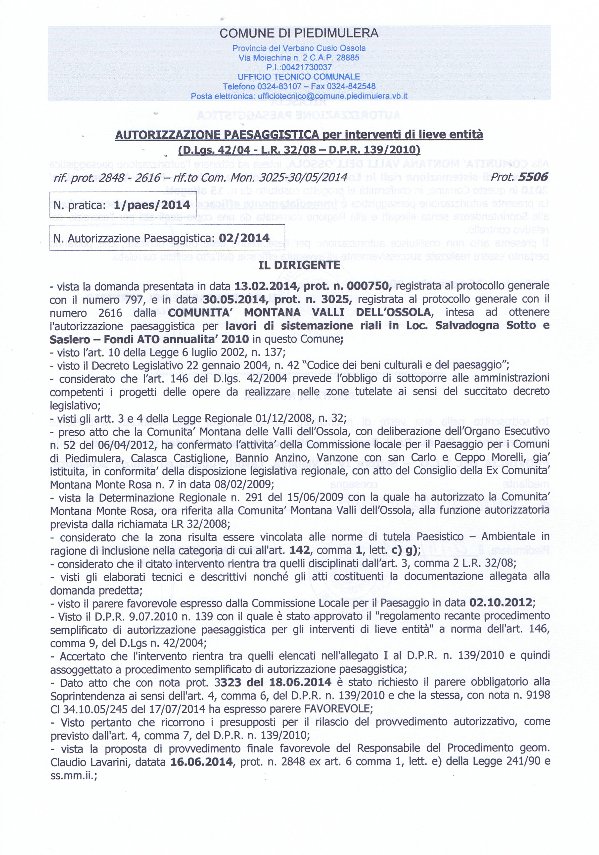 | Descrizione | COMUNITA' MONTANA VALLI DELL'OSSOLA - LAVORI DI SISTEMAZIONE RIALI IN LOC. SALVADOGNA SOTTO E SASLERO - FONDI ATO ANNUALITA' 2010 |