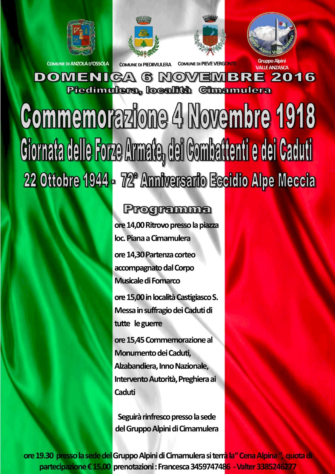 Commemorazione 4 Novembre 1918 - Giornata delle Forze Armate, dei Combattenti e dei Caduti - 22 Ottobre 1944 - 72° Anniversario Eccidio Alpe Meccia